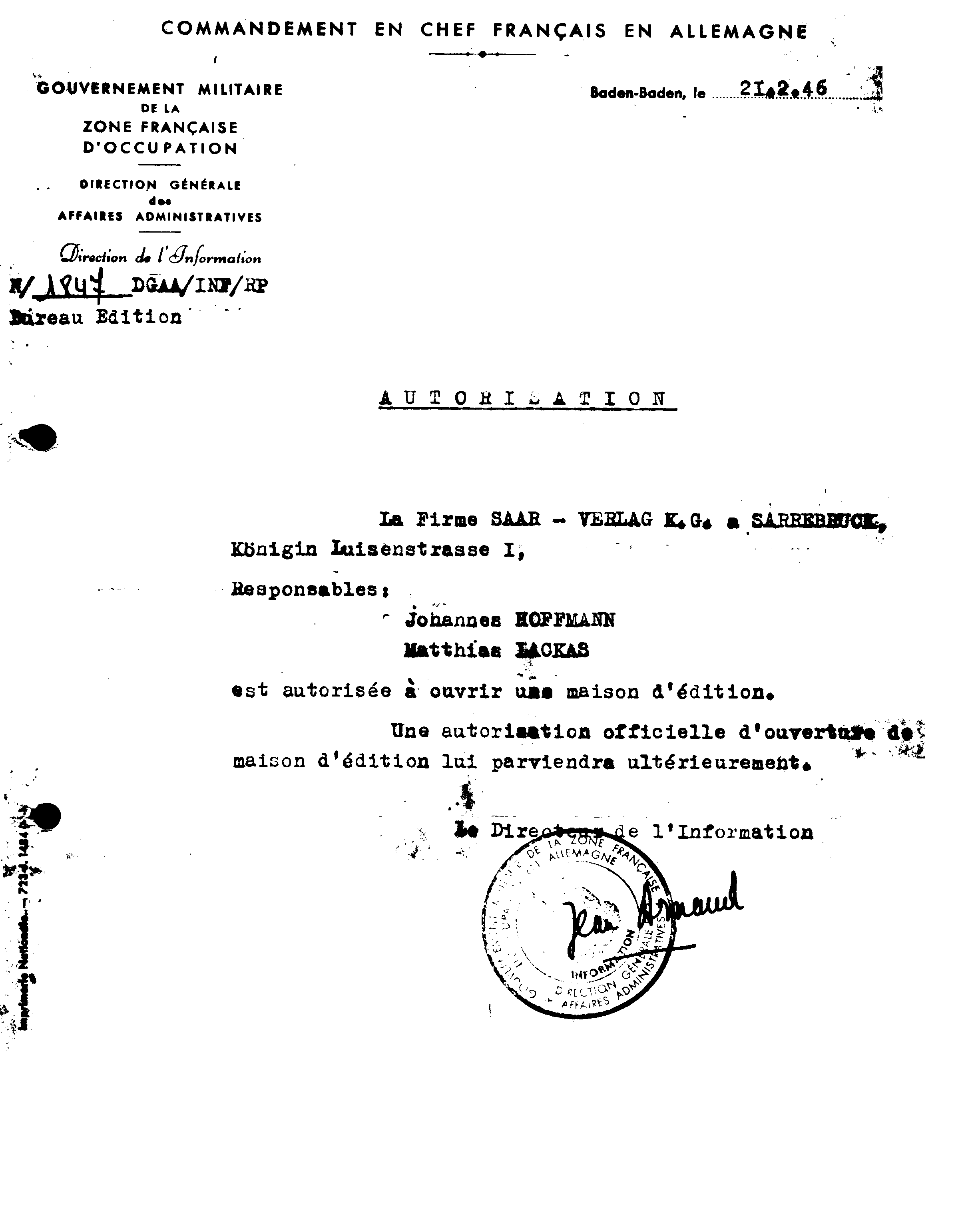 Lizenz für den Saar-Verlag, Saarbrücken an Johannes Hoffmann und Matthias Lackas (Französische Zone) vom 21.2.1946, Quelle: Privatbesitz Walter Banger Marbach/Neckar.